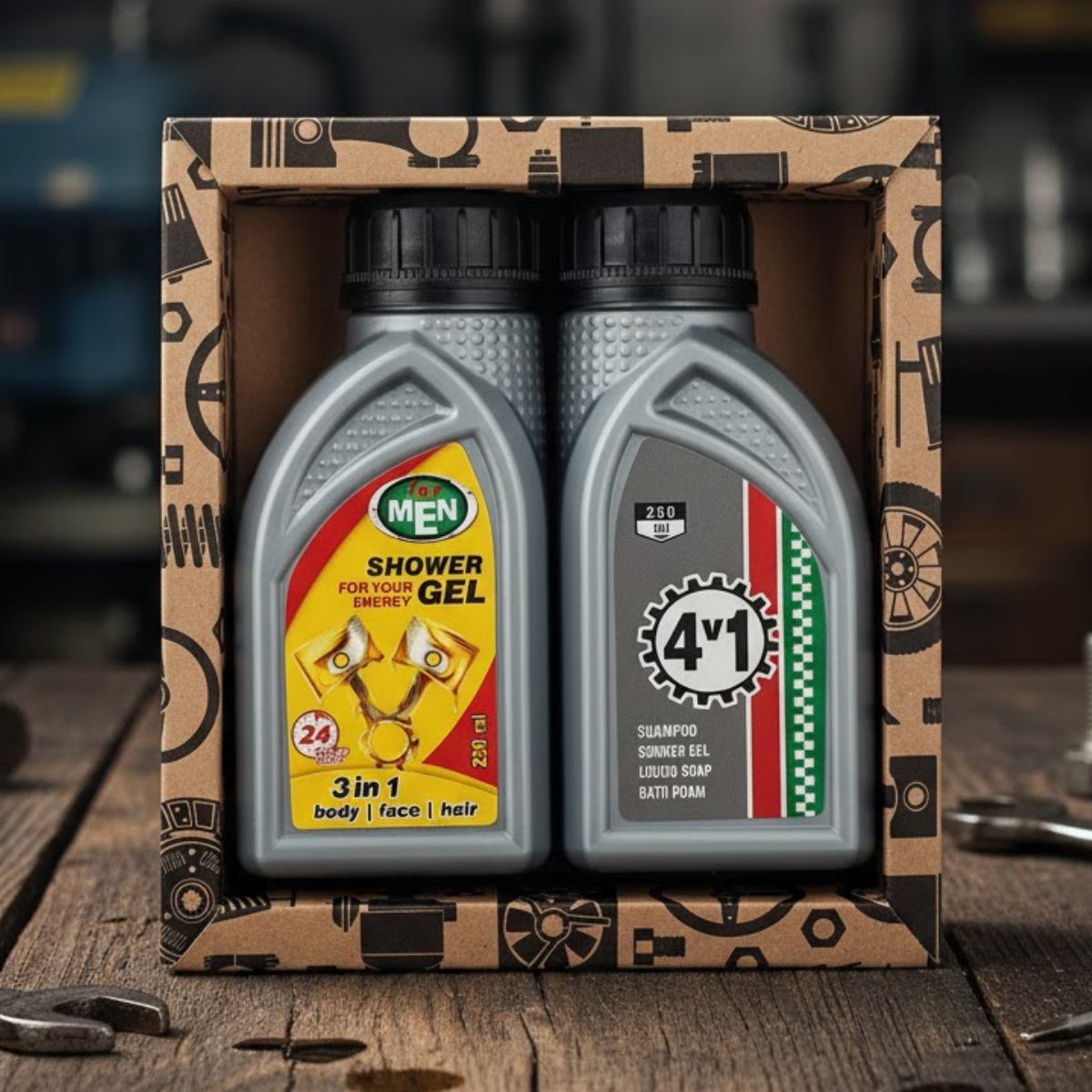 Dušas želejas un šampūna iepakojumi izskatās kā auto smērvielas pudeles, tāpēc šis komplekts ir ideāli piemērots vīriešiem, kuriem ne tikai patīk rūpēties par savu ķermeni, bet arī tiem, kas novērtēs asprātīgas un praktiskas dāvanas.