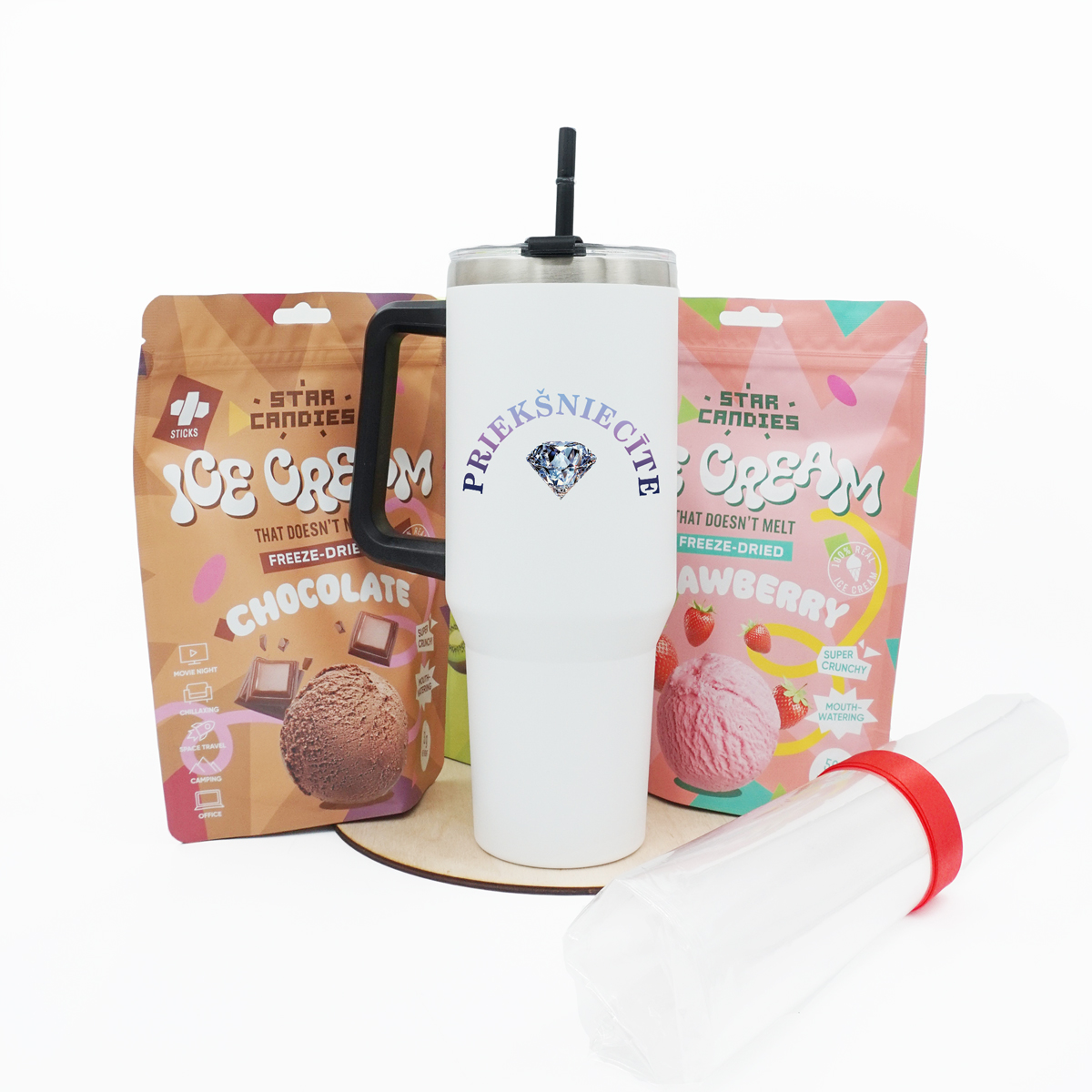 Dāvanu komplektu var iesaiņot kā dāvanu, pievienoti iepakojuma piederumi (lente un dāvanu iesaiņojamais papīrs).